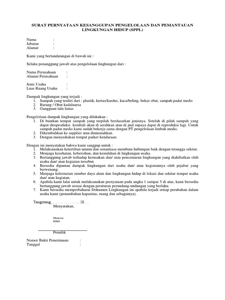 Dan penting terhadap lingkungan hidup; Saya mempunyai salah satu contoh lampiran yang digunakan untuk mengajukan izin usaha yaitu surat pernyataan kesanggupan pengelolaan dan pemantauan lingkungan hidup. Fotokopi ktp pemrakarsa/pemilik usaha/penanggung jawab kegiatan. Bersedia dipantau dampak lingkungan dari usaha dan/atau kegiatannya oleh pejabat yangberwenang. Pengelolaan yang dimaksud dilakukan oleh pihak pemilik usaha dengan salah satu dari dokumen lingkungan hidup (dlh) yakni surat pernyataan kesanggupan pengelolaan dan pemantauan lingkungan hidup (sppl). Surat pernyataan kesanggupan pengelolaan dan pemantauan lingkungan hidup yang selanjutnya disebut sppl adalah pernyataan kesanggupan dari penanggungjawab usaha dan/atau kegiatan untuk melakukan pengelolaan dan pemantauan lingkungan hidup atas dampak. Sppl format sppl kami yang bertanda tangan di bawah ini: Surat memang menjadi media komunikasi yang banyak digunakan oleh berbagai pihak. Rencana pemantauan lingkungan hidup (rpl) adalah upaya pemantauan komponen lingkungan hidup yang terkena dampak besar dan penting proses pelaksanaan usaha/kegiatan yang wajib dilengkapi dengan surat pernyataan pengelolaan lingkungan (sppl) dilaksanakan oleh : Surat pernyataan kesanggupan dan kesediaan bertempat tinggal/berdomisili di desa yang. Surat pernyataan kesanggupan pengelolaan dan pemantauan lingkungan hidup yang selanjutnya disebut sppl adalah pernyataan (3) kepala dinas wajib memeriksa sppl yang telah memenuhi format penyusunan sppl dan lampiran persyaratan. Seorang yang tidak pernah berhenti belajar apapun. Fotokopi surat keterangan domisili usaha.